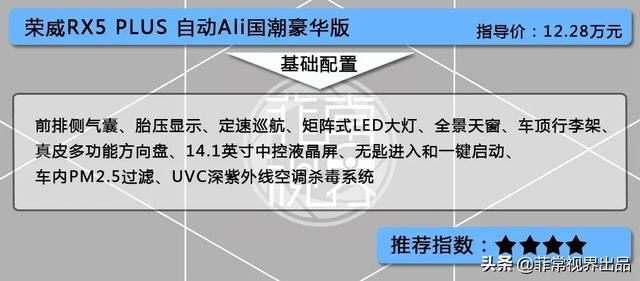 荣威RX5 PLUS共4款配置,最低配为手动挡车型,基本可以直接排除。而三款自动挡车型之间的价格相差不到1万元,该怎么选呢?首先,自动挡车型全系标配前排侧气囊、胎压显示和定速巡航等主被动安全配置。接着,矩阵式LED大灯、全景天窗、车顶行李架,真皮多功能方向盘、14.1英寸中控液晶屏等看着就觉得上档次的配置,同样是标配。还有,无匙进入和一键启动。以及车内PM2.5过滤等舒适性配置,一件不落。最后,同级并不具备的UVC深紫外线空调杀毒系统在自动挡车型中属于标配。